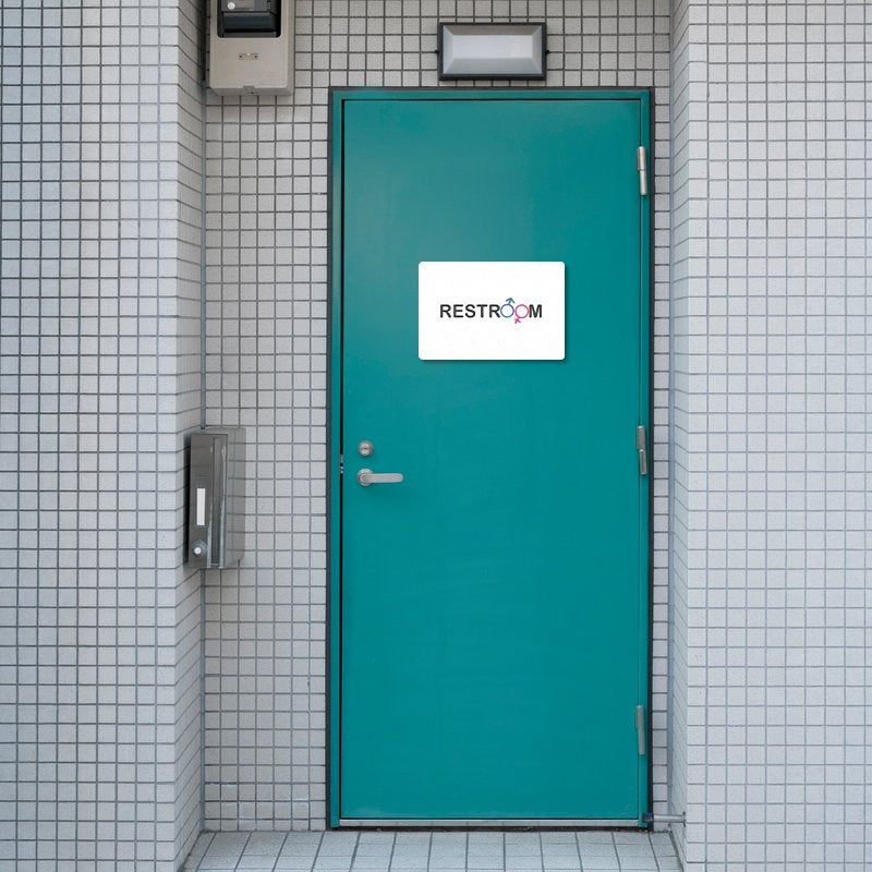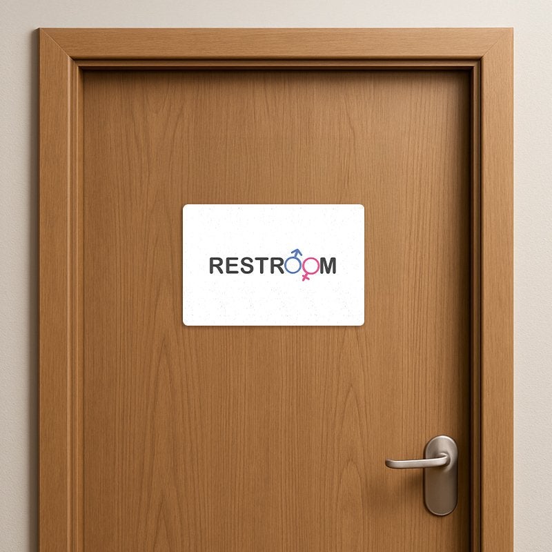 Welcome everyone with this inclusive all-gender restroom sign. Featuring overlapping male and female symbols in the word "Restroom," this sign delivers a clear, professional message that your bathroom is open to all genders. The neutral design blends easily into modern office, retail, or educational environments.