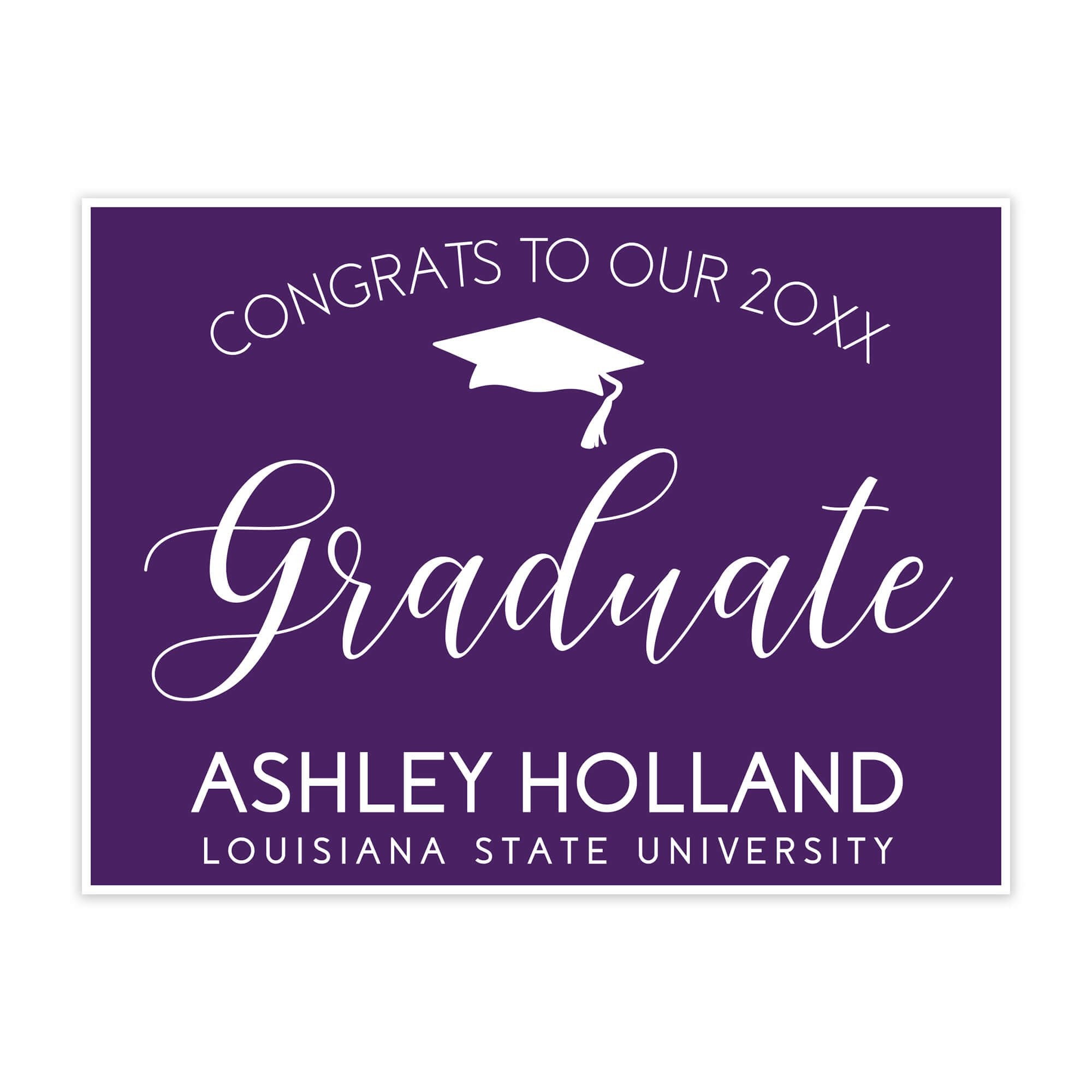 "Congrats to our 2026 Graduate" Graduation Yard SignGraduation Yard Sign with Custom Name & SchoolAvailable in small (18"x12"), standard large (folded 24"x18")*, or premium large (24"x18")Choice of single or double sided designOptional laminate for extended outdoor use and protectionOptional wire H-stake for easy mountingBulk order discounts are available*Folded yard signs are our customer-centric solution to saving you money! You'll enjoy reduced shipping costs without compromising on the exceptional quality you expect. Plus, they're incredibly easy to store for future use. (The fold is made by a small incision down the back side of the sign and shows little to no signs of bending once unfolded)