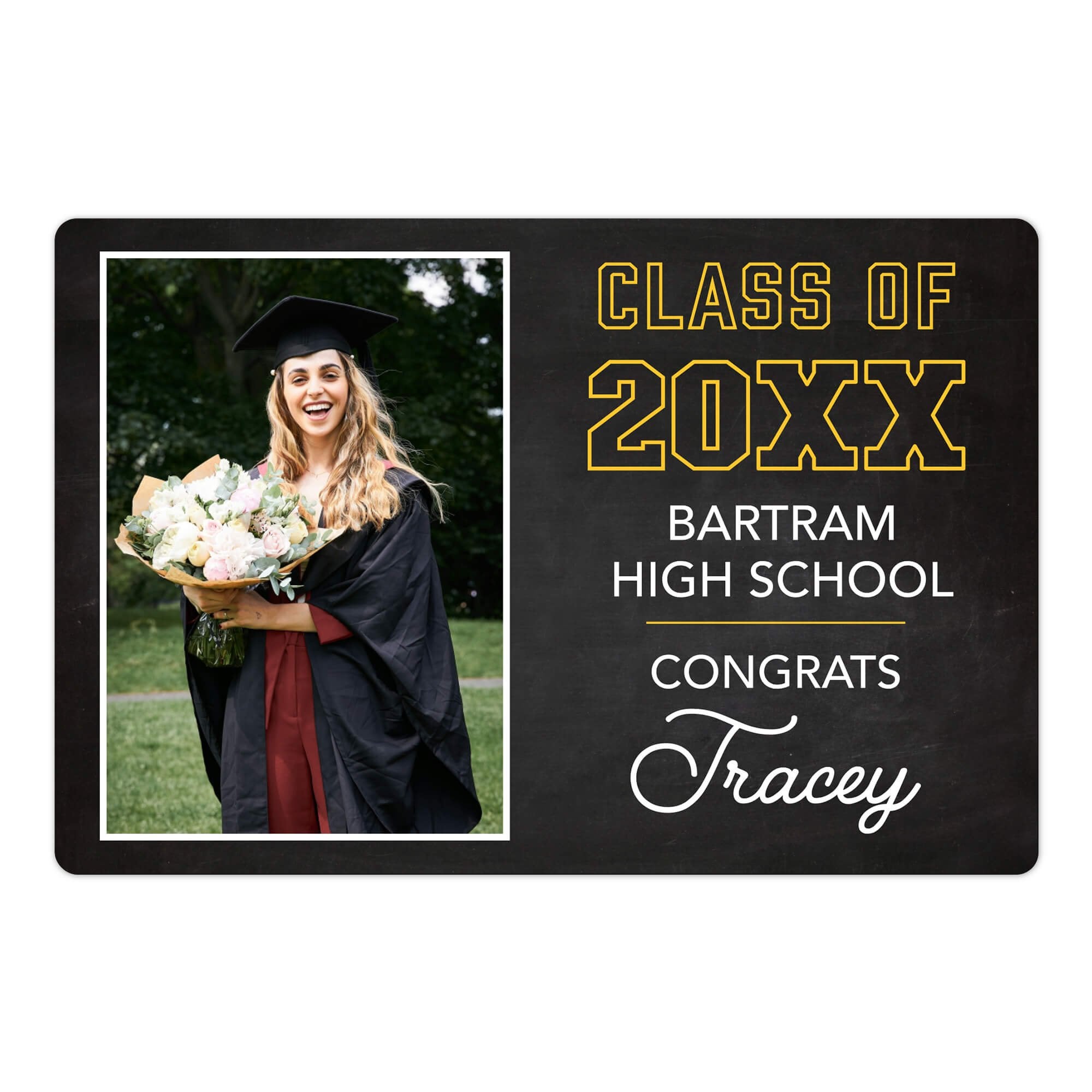 - Fully customizable: Add a graduate’s name, school, and an image to make it truly unique.