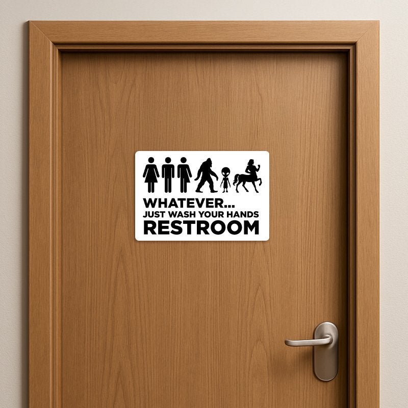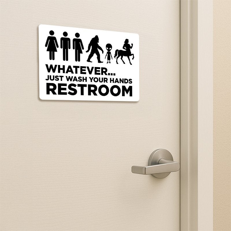 Break the ice and get a few laughs with our funny Whatever… Just Wash Your Hands Restroom Sign. Whether you're a human, centaur, alien, or just someone needing a break—this sign makes it clear that everyone is welcome... as long as they wash their hands.