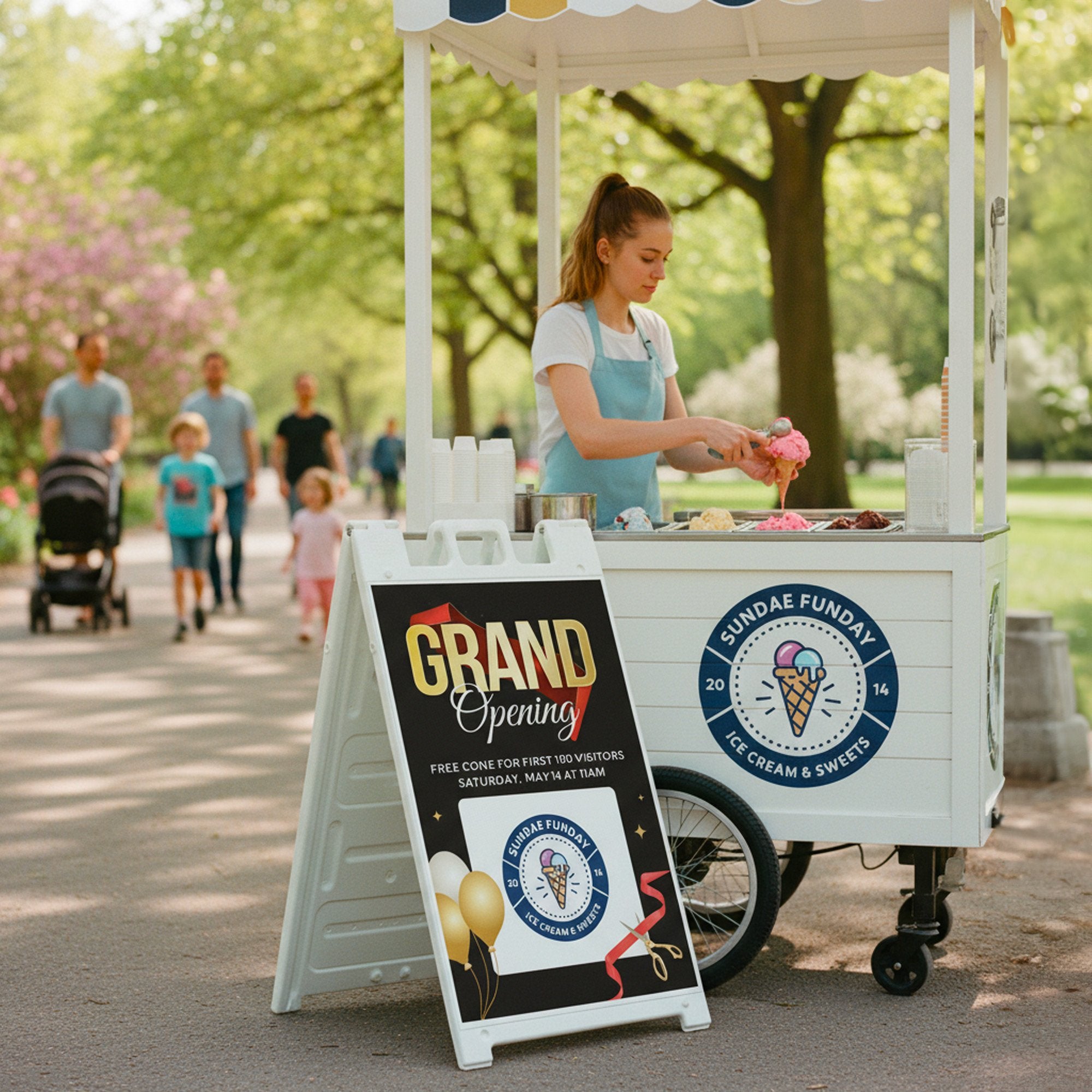 Ideal for storefronts, pop-ups, and event spaces, this double-sided A-frame sign helps attract foot traffic and build excitement around your opening. The festive layout, complete with celebratory design elements, makes it especially effective for temporary promotions and grand opening announcements. With replaceable inserts and customizable content, you can easily update the message for future events, seasonal promotions, or ongoing marketing campaigns while maintaining a polished and cohesive look.
