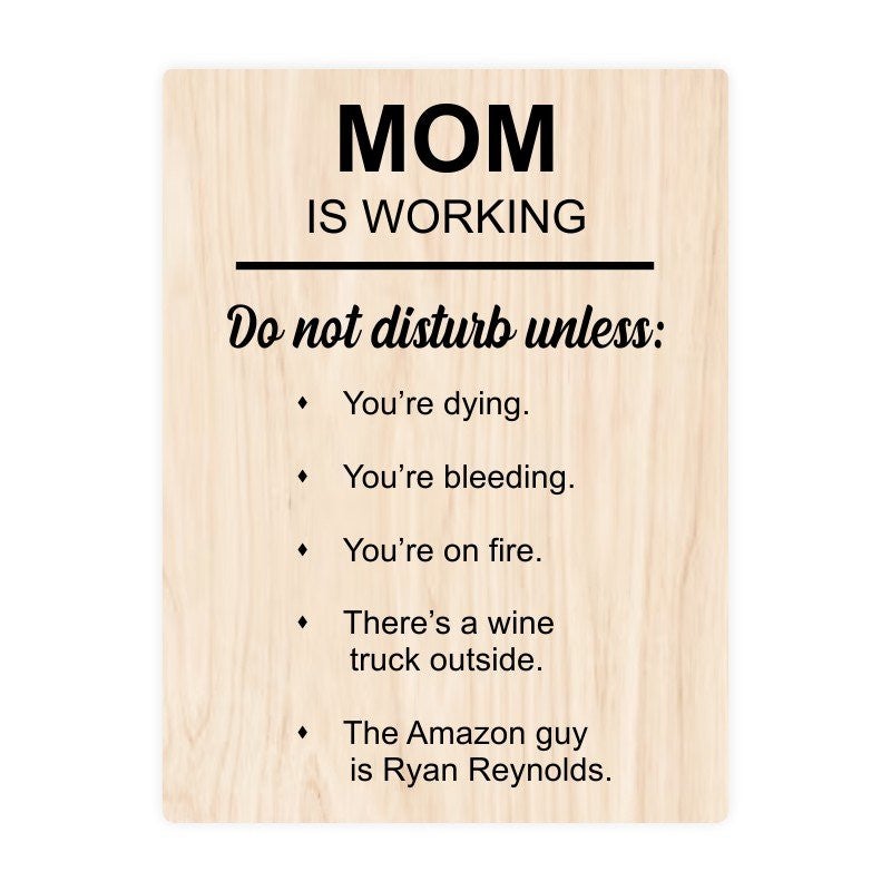The Mom is Working Sign is the perfect addition to any home office or workspace. Featuring a light woodgrain-style background and bold, playful text, this sign lets kids, partners, and surprise visitors know that mom’s in work mode—so think twice before interrupting! Whether you’re in an important meeting or just need a quiet moment, this sign makes it clear when NOT to disturb mom—unless, of course, Ryan Reynolds is at the door.