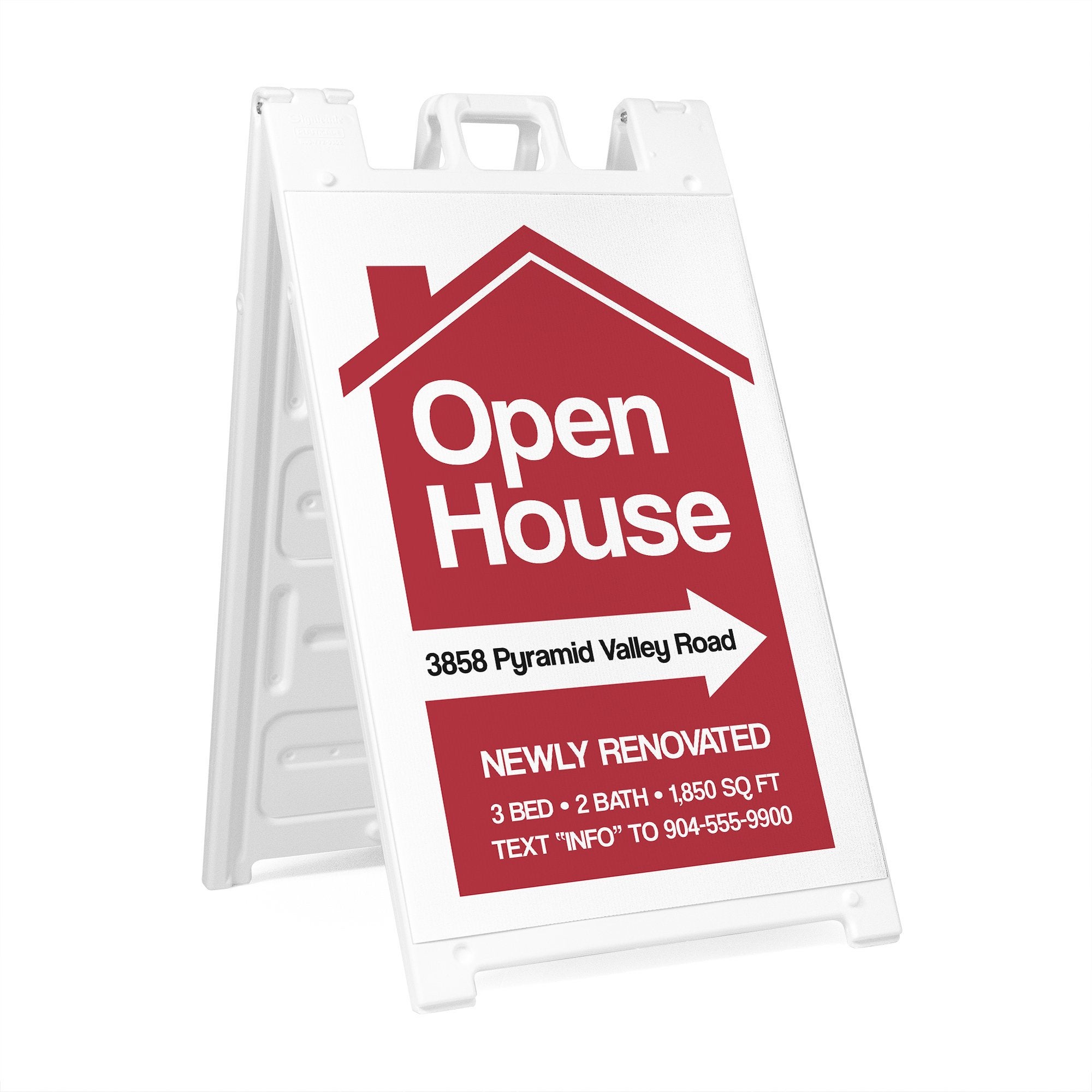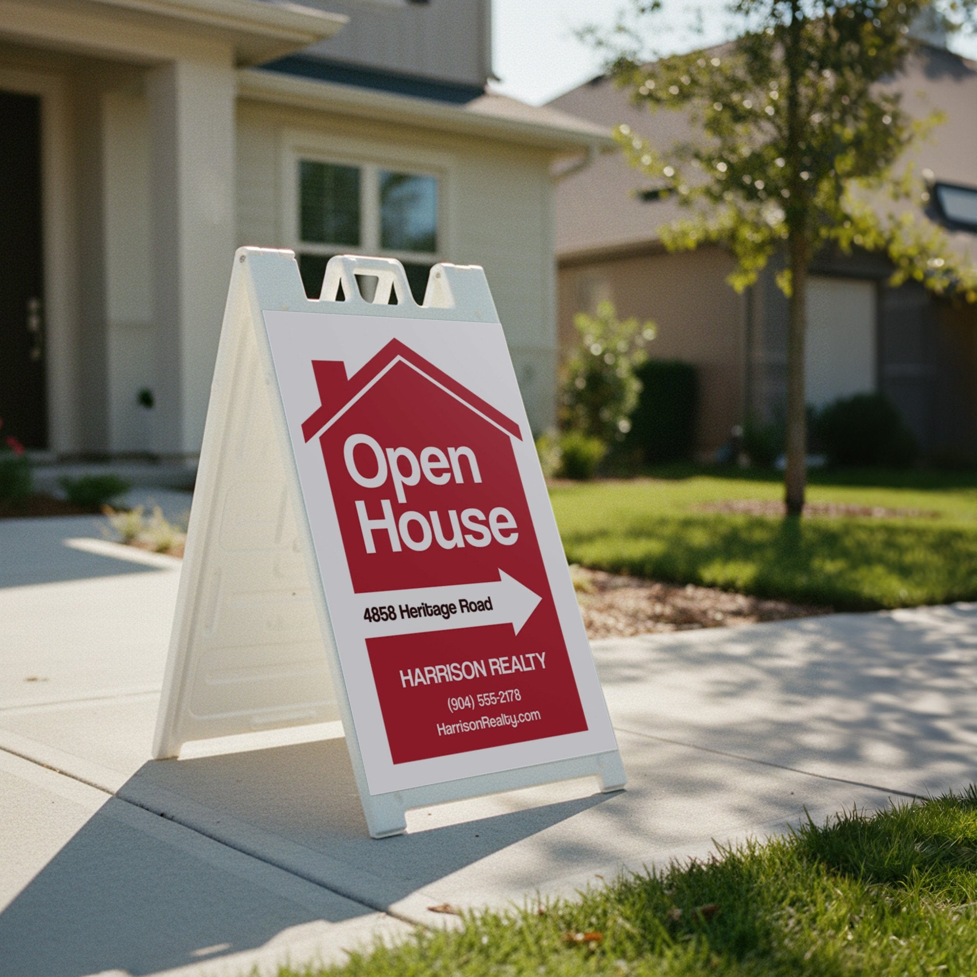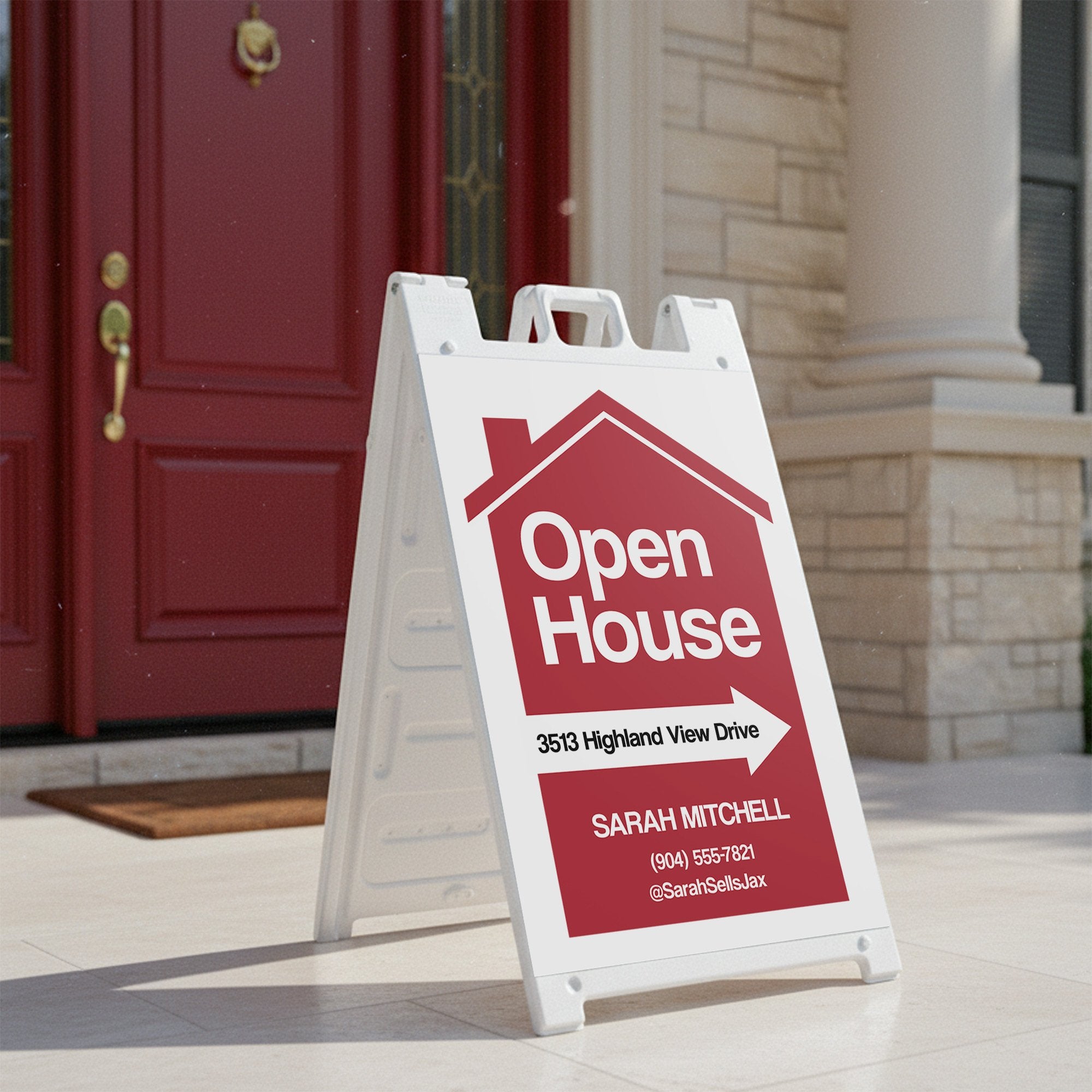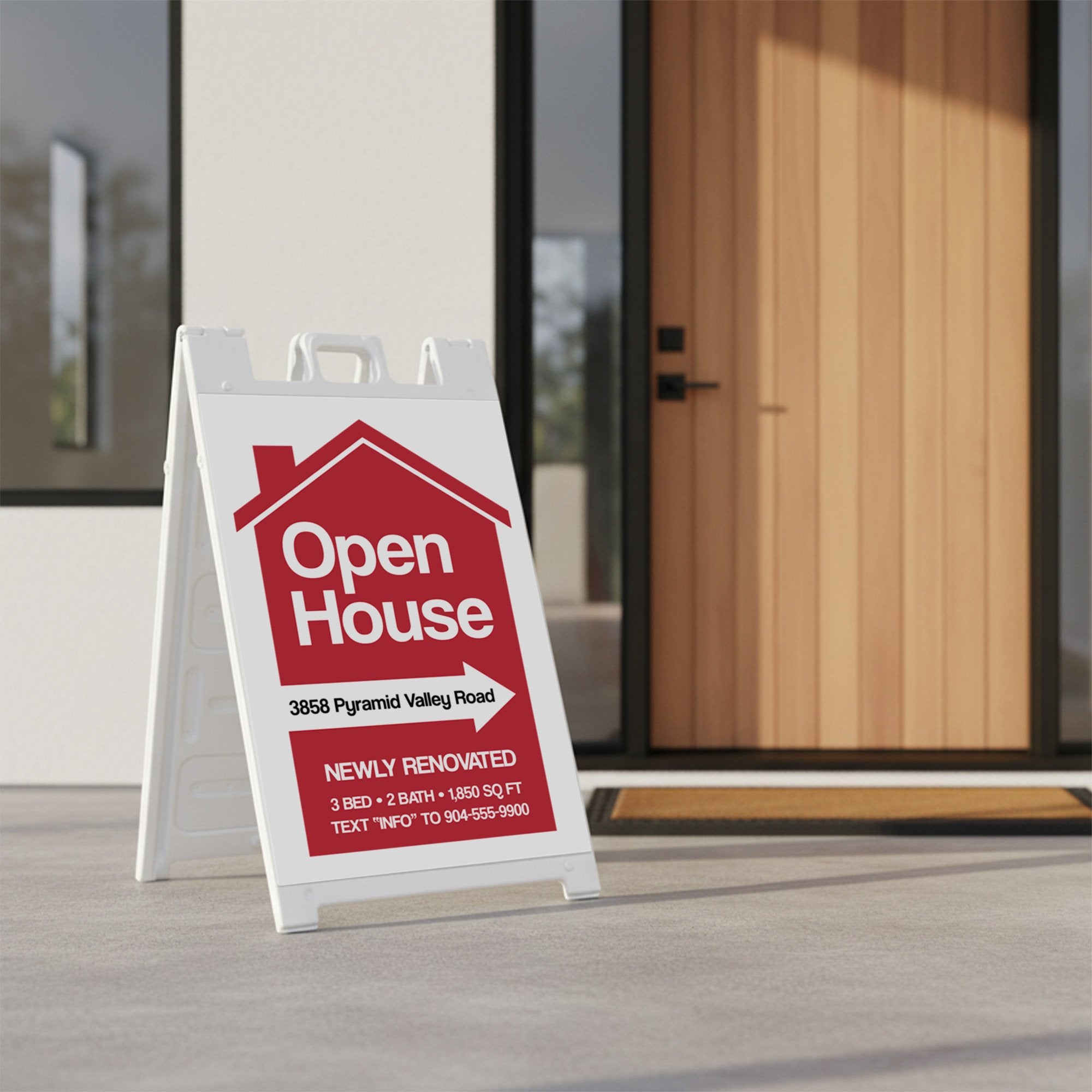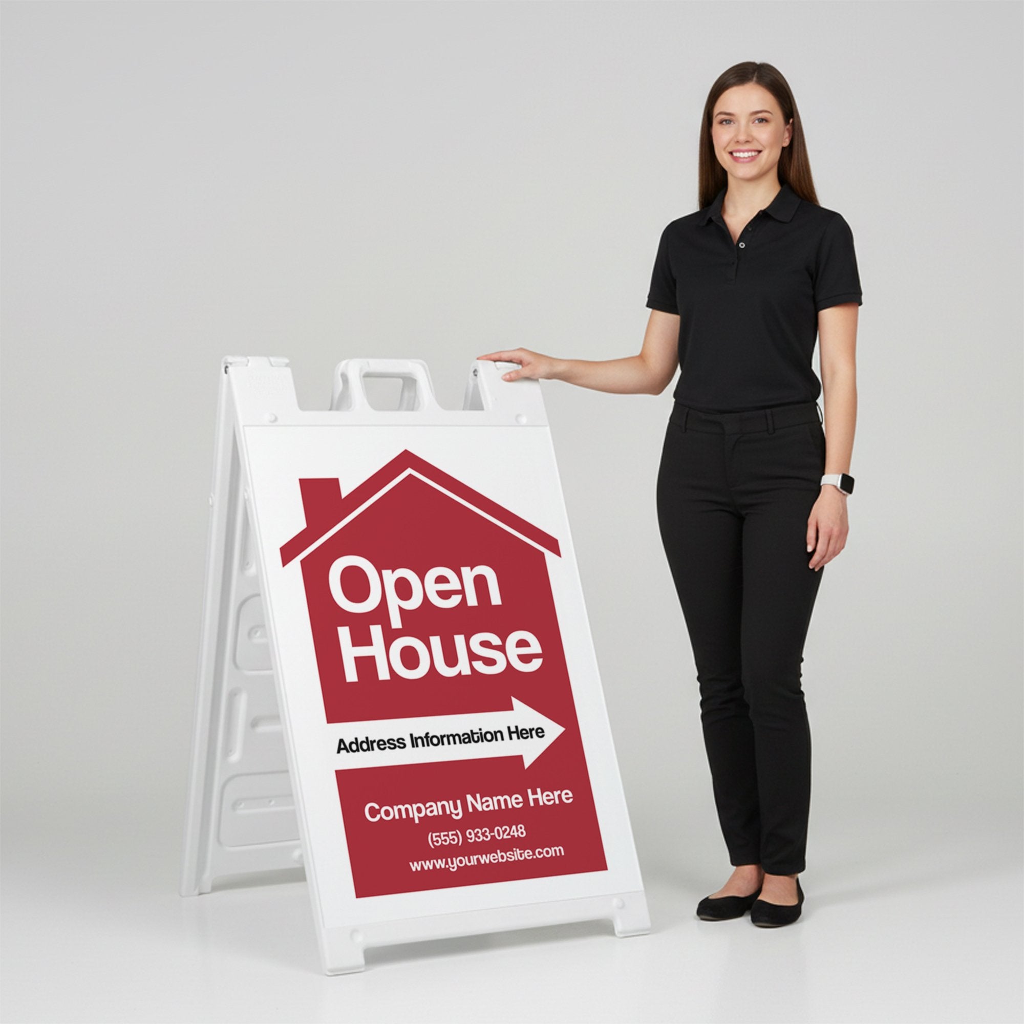 Built for outdoor placement and high-visibility display, this double-sided A-frame sign helps guide traffic from multiple directions during open houses, showings, and property tours. The replaceable insert system makes it easy to update listing details, agent information, or contact numbers for different properties without purchasing a new sign each time. Its portable A-frame structure allows for quick setup at entrances, street corners, and driveways, making it a practical and reusable solution for realtors, property managers, and event hosts.