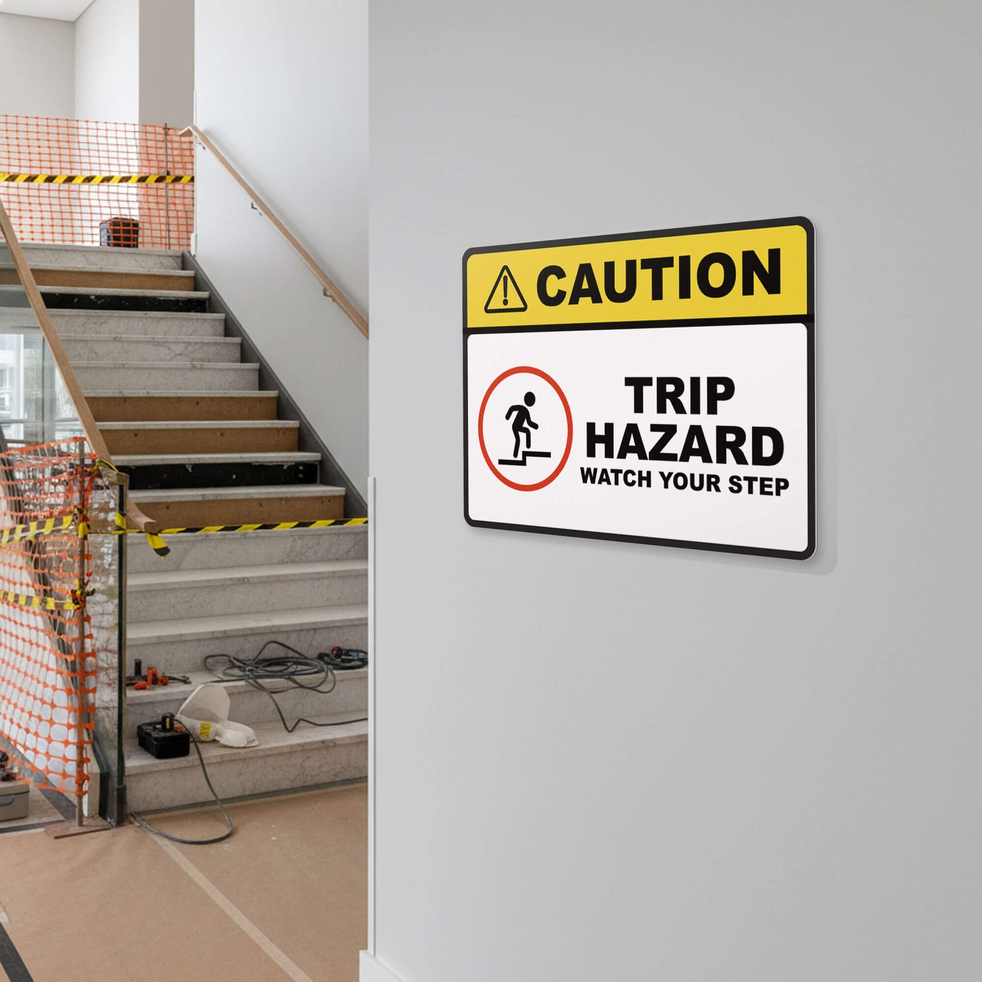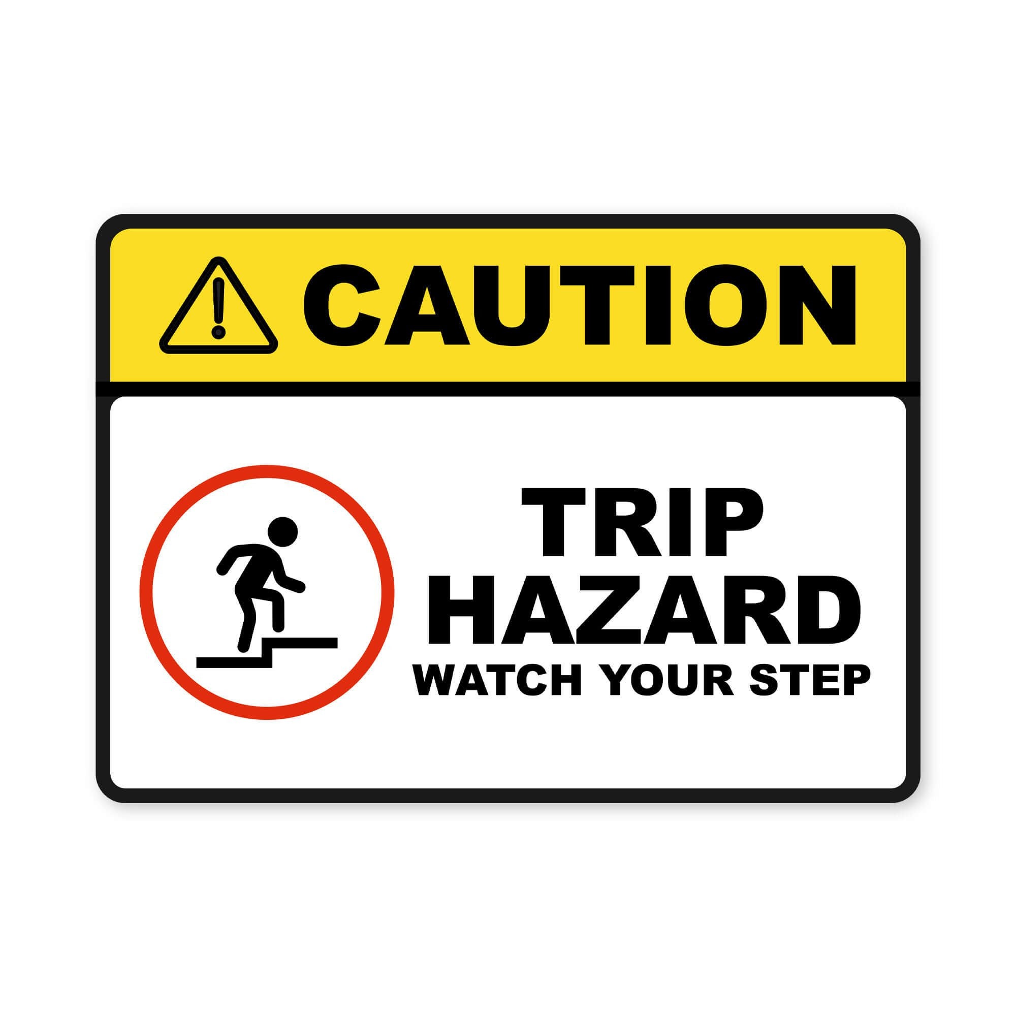 - Important Messaging: Sign reads “Trip Hazard Watch Your Step” with a helpful pictogram next to it.