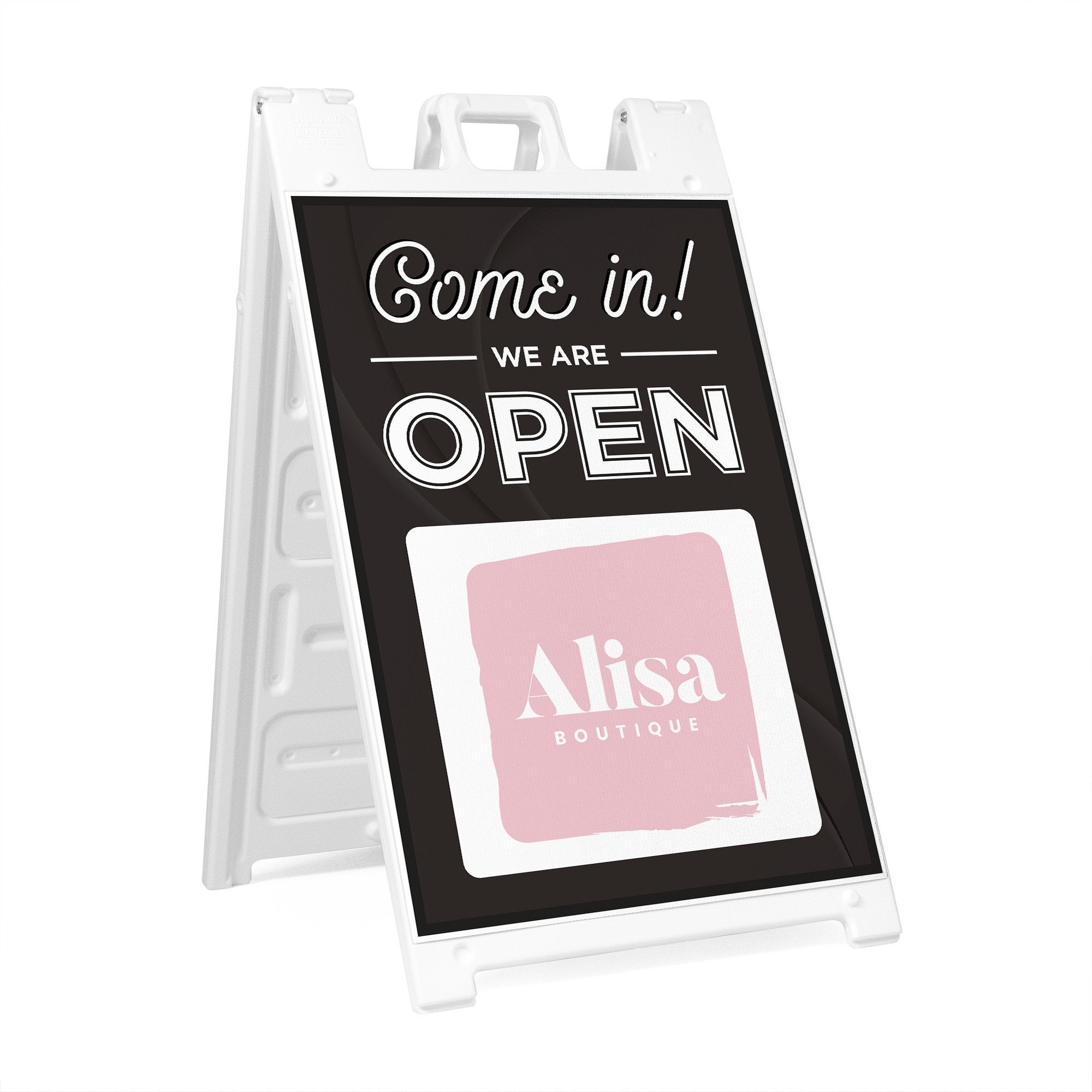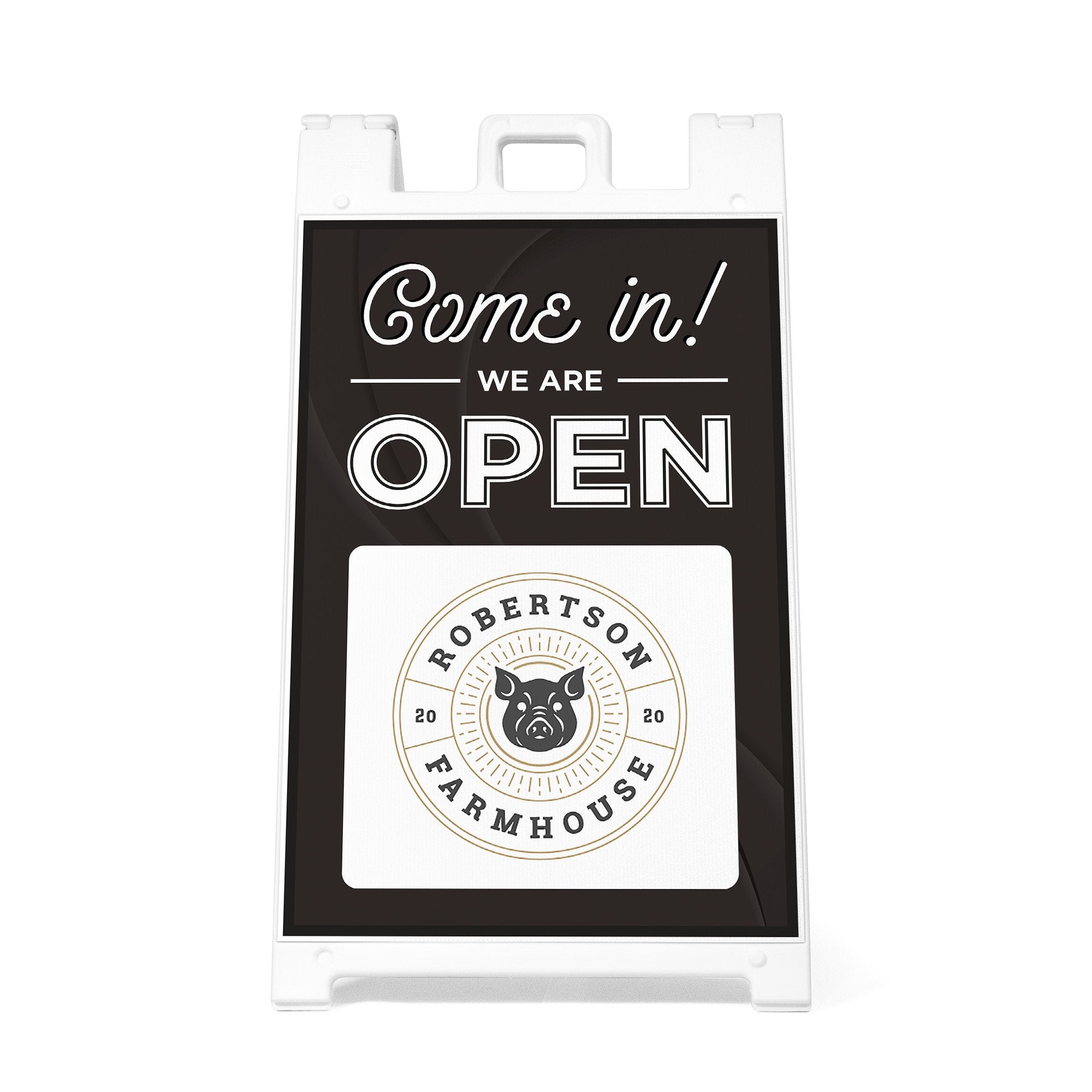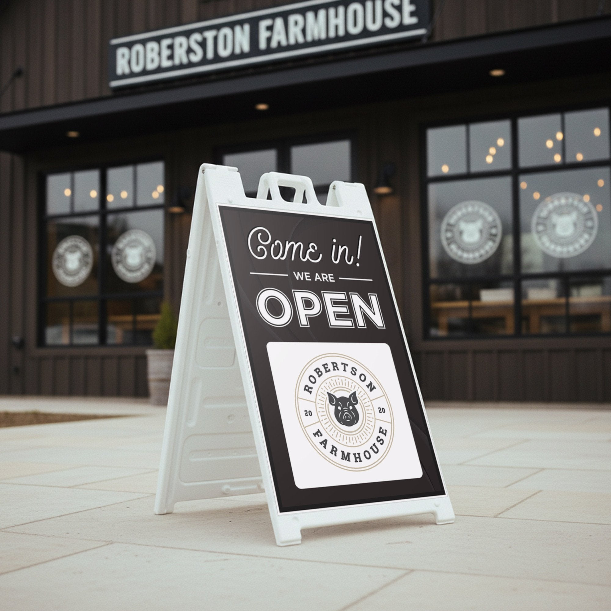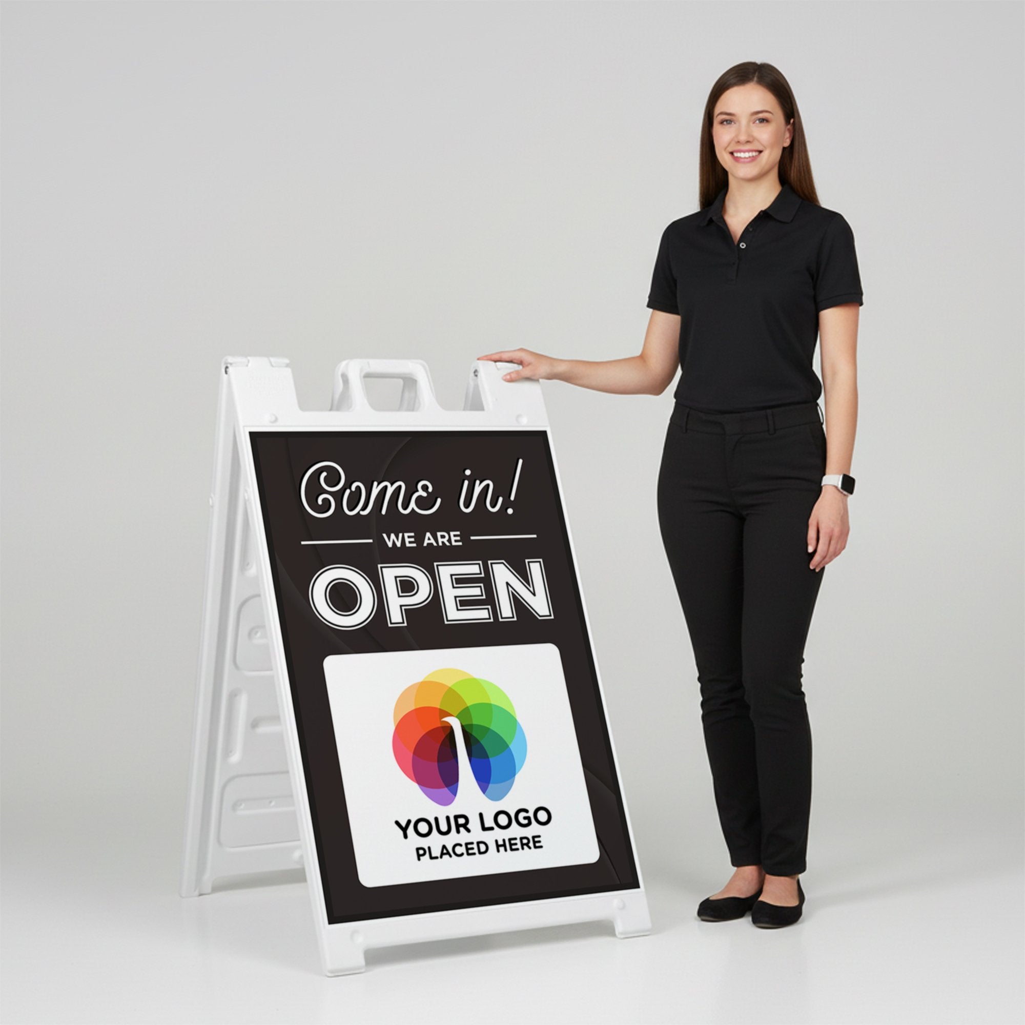 Designed for both indoor and outdoor use, this double-sided A-frame sign keeps your open message visible from multiple directions in high foot traffic areas. The replaceable insert system makes it easy to update branding or messaging as needed, while the portable A-frame structure allows for quick setup, repositioning, and storage at the end of the day. Ideal for retail stores, restaurants, salons, and service businesses, this sign provides a professional and reusable solution for communicating business hours and welcoming guests.