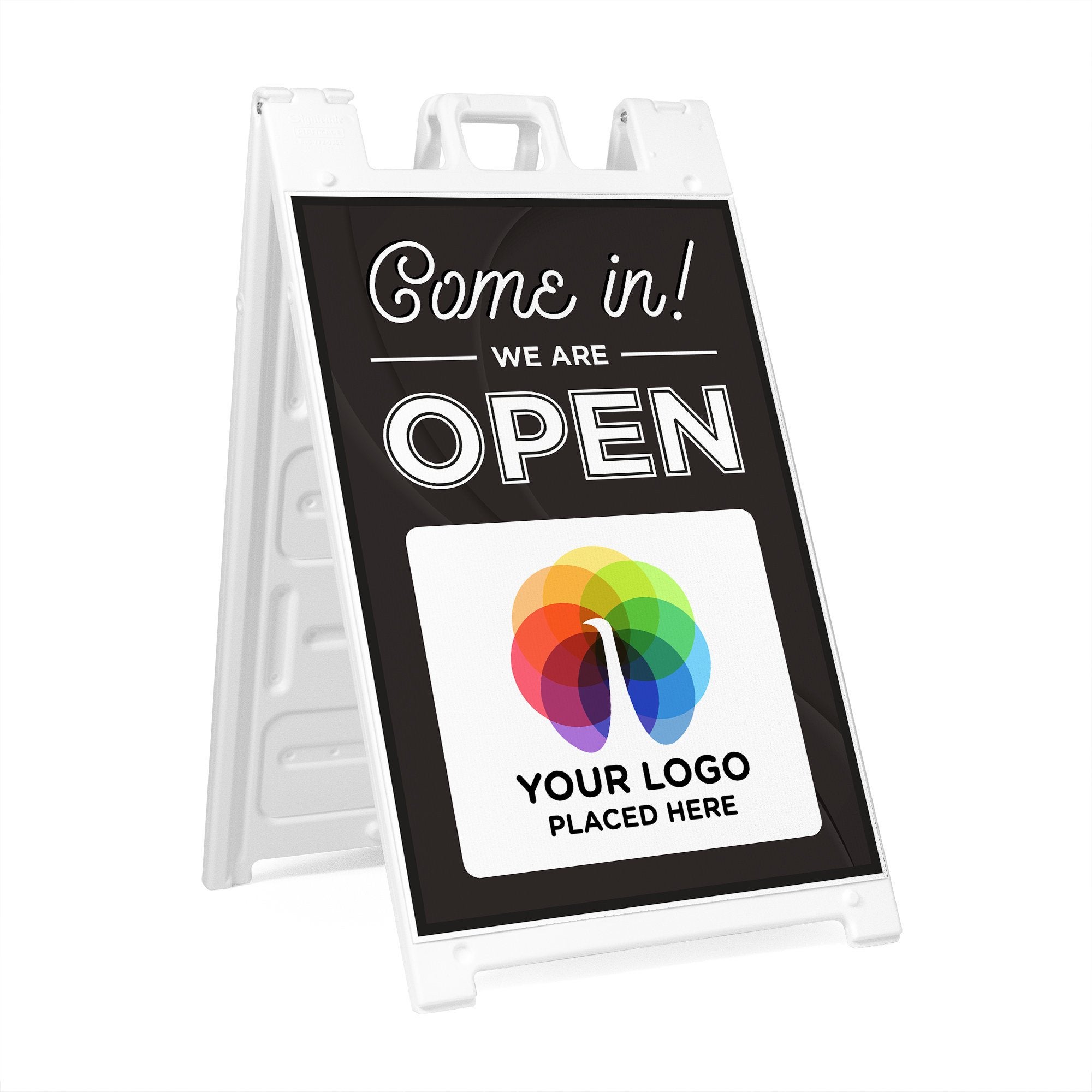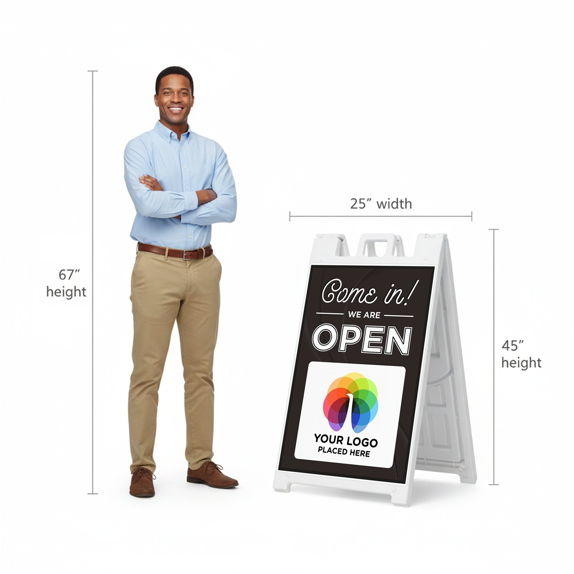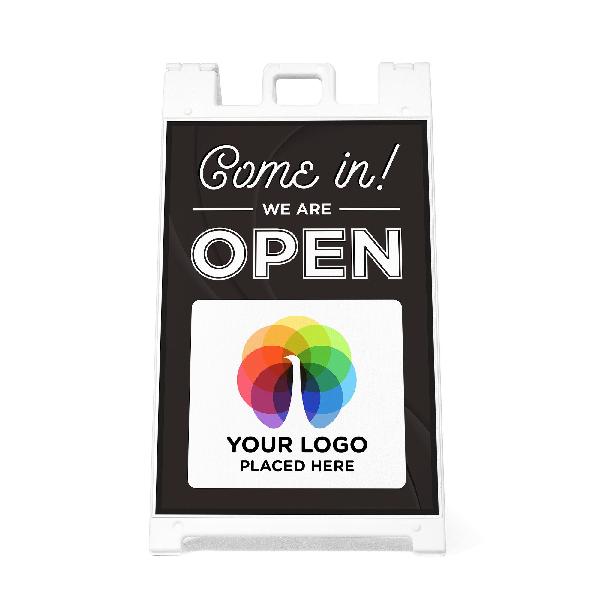 Let passing customers know you are open and ready for business with this customizable “Come In, We Are Open” A-Frame sign. The design includes a dedicated logo upload area, allowing you to showcase your brand while delivering a clear and welcoming message at your storefront, entrance, or sidewalk display.